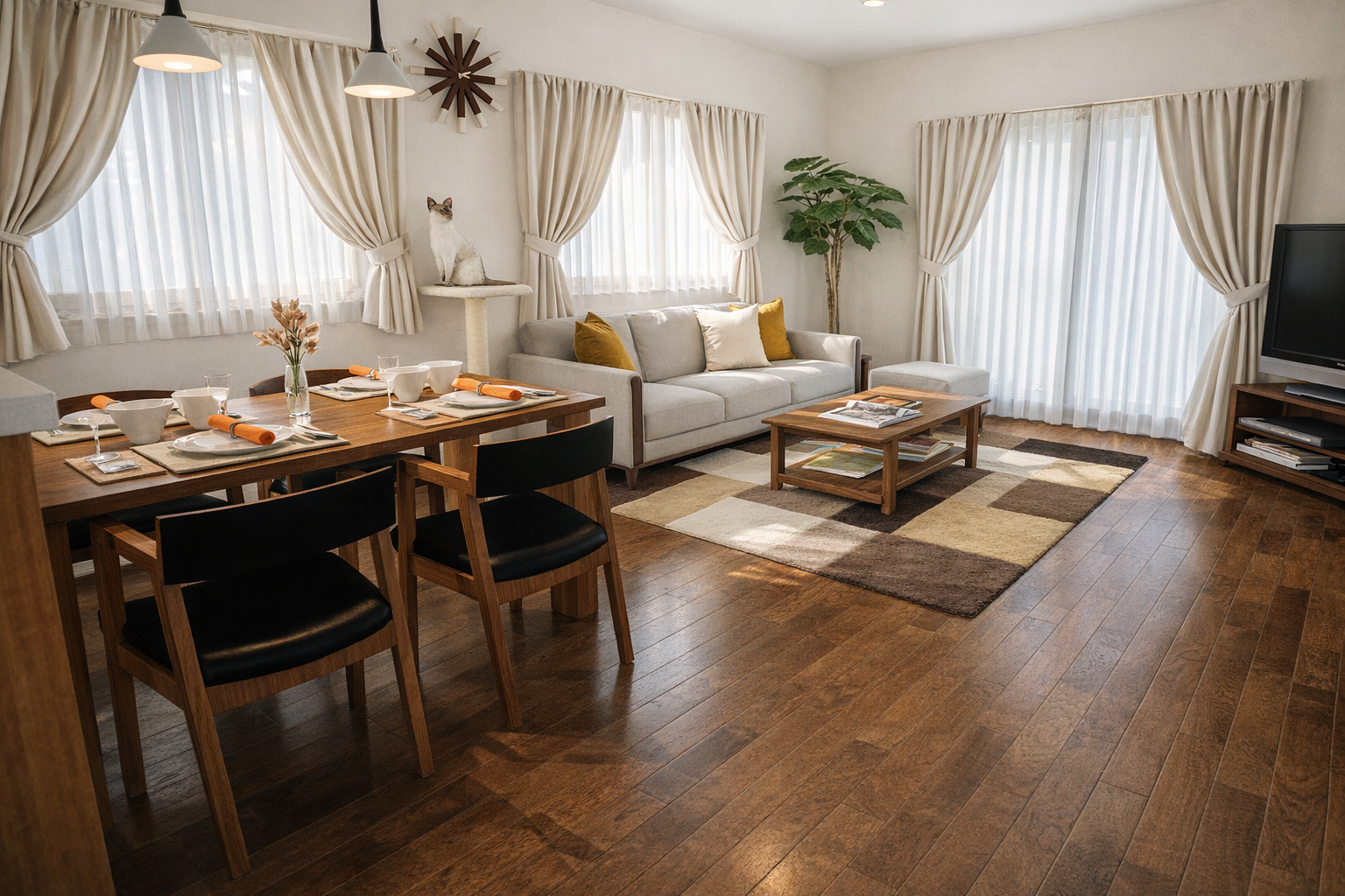 猫が自由に行き来できる動線や視線の抜けを大切にし、家族が同じ空間でそれぞれの時間を楽しめるレイアウトに整えています。