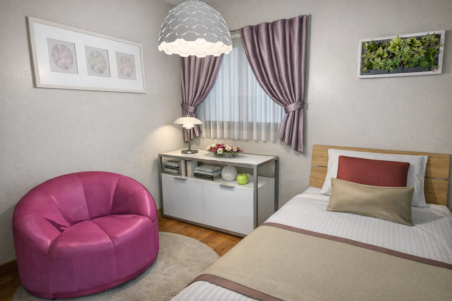 奥様のお部屋は「ここにいるとほっとする」をテーマに、奥様のお好きな色を取り入れながら、やさしく包まれるようなコーディネートに。